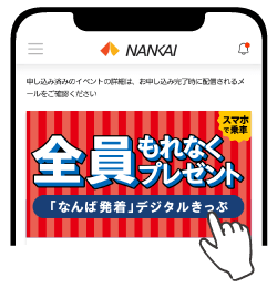 本ページ下部の「デジタルきっぷの取得方法」欄に記載の方法によりお申込みいただくと、もれなく全員に2025年12月27日(土)限定の「なんば発着」デジタルきっぷをプレゼントします!デジタルきっぷをもらっておでかけしよう!